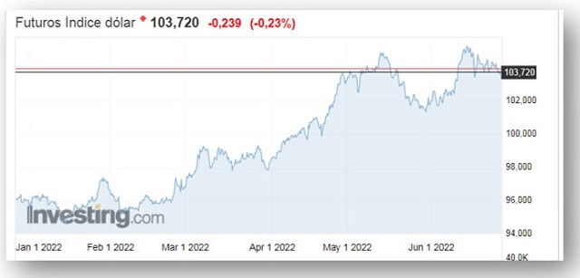 Así, el índice dólar alcanzó un máximo de 105,79 unidades (14/06/22), el más elevado nivel en casi dos décadas.