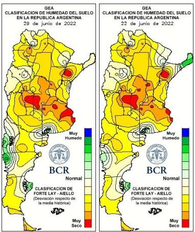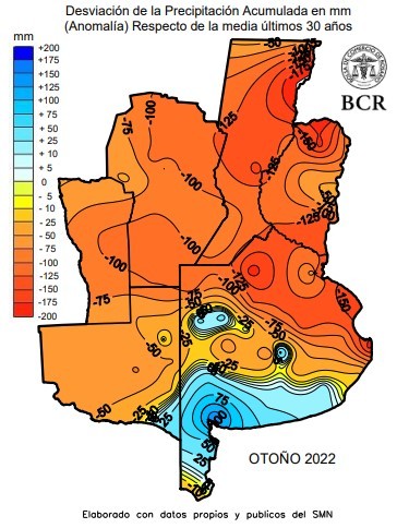 En Santa Fe faltan entre 100 y 150 mm para llegar las medias históricas de lluvias del otoño. En Córdoba la deuda es de 75 a 125 mm. Y en el 37% de Buenos Aires, en el noreste, el otoño 2022 le debe 100 a 150 mm para alcanzar los valores estadísticos de lluvias de la estación que cumple la función de recargar los suelos. Esta es una de las grandes causas de porqué el mapa de reservas de agua edáfica está en naranja y rojo —o sea seco y muy seco— en casi el 50% de la región pampeana. Y se si analizan las estadísticas por localidades, hay datos que sorprenden. Por ejemplo, el otoño 2022 es el más seco desde 1963 en Junín (Buenos Aires). Allí, solo llovieron 79 mm (del 21/3 al 21/6) por lo que faltan 186 mm para alcanzar la media de las lluvias de otoño (232 mm). Hay que retroceder casi 60 años para encontrar un otoño más seco. Para Río Cuarto, Córdoba, el actual es el otoño en el que menos llovió desde 1961: solo llovieron 28 mm. En Córdoba capital, con 12 mm, el 2022 es el otoño más seco desde que hay registros, o sea desde 1986. En Santa Fe, en Rosario, este otoño dejó 126 mm contra los 234 mm de media. En Rafaela, acumuló 95 mm (vs los 205 mm de media). Volviendo a Buenos Aires, en Las Flores, el otoño 2022 registró 121 mm, casi la mitad de la estadística (236 mm).