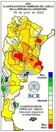 El consultor de GEA Alfredo Elorriaga, explica: “la falta de agua en la franja oeste y este del país es algo que hace mucho que no sucede. Por eso son muy malas noticias que las últimas tormentas (martes 28) tampoco haya dejado milímetros en Buenos Aires. El posicionamiento que han tenido los centros de alta y baja presión han evitado las circulaciones que permiten el ingreso de aire húmedo desde el este. Esto no es casual, el Atlántico muestra un moderado enfriamiento en la costa argentina hasta el sur de Brasil que afecta negativamente la situación actual”. Aiello agrega que “los pronósticos de corto plazo muestran alguna actividad atmosférica en el inicio de julio, aunque modesta y con un comportamiento similar a las lluvias del final de junio. La primera década del nuevo mes no provocaría grandes cambios en el régimen de precipitaciones. Todo indica que tendremos por delante un invierno con pobre aporte de agua, con una distribución de humedad muy exigida para los cultivos de la fina. Esto solo podría revertirse con un mejor comportamiento pluvial en el próximo cambio de estación”.