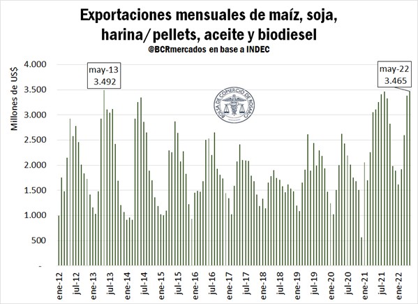 En cuanto a las exportaciones efectivas, el mes de mayo culminó con varios récords históricos en términos de valor, producto de los elevados precios internacionales vigentes para la mayor parte de los commodities agroindustriales. Los envíos al exterior de maíz en grano alcanzaron un valor de US$ 930 millones, mientras que los despachos de aceite de soja totalizaron US$ 901 millones y los de biodiesel US$ 211 millones, alcanzando todos estos productos un máximo histórico para un mes de mayo. Además, para el caso del aceite de la oleaginosa, el valor alcanzado en términos de exportaciones marcó un récord mensual para cualquier mes de años anteriores, no solo para un mes de mayo. En cuanto a la harina/pellets de soja, el valor alcanzado sumó US$ 1.297 millones en el quinto mes del año, alcanzando así el segundo mejor mayo de la historia. Por último, en concordancia con el bajo volumen de ventas externas de poroto de soja, las exportaciones efectivas durante mayo sumaron US$ 126 millones, el menor valor de los últimos 10 años para igual mes.
