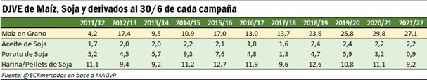No así para los subproductos de la oleaginosa, a saber, harina y pellets de soja, en donde se declararon 9,2 Mt de exportaciones para 2021/22, representando una notoria disminución respecto de la campaña 2020/21 con un total declarado de más de 11Mt, representando una reducción del 17% en el nivel de DJVE, y un 15% inferior a las 10,8 Mt declaradas en la campaña 2019/20. Hay que tener en cuenta que los subproductos de soja representan casi el 75% de las exportaciones del complejo sojero del país, por lo que esta fuerte disminución en los niveles de DJVE produce un impacto significativo en los balances de Argentina.