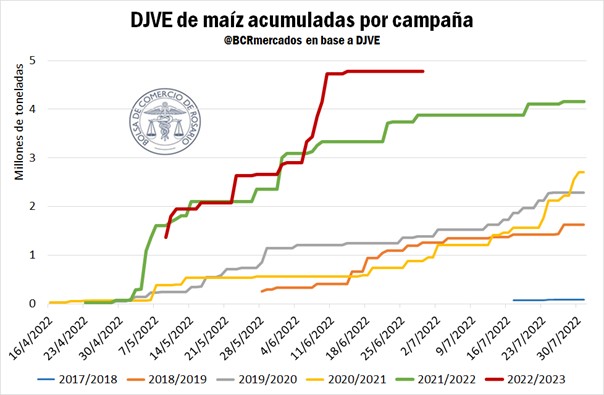 En los primeros días de junio continuó alto el dinamismo de las ventas externas de maíz del nuevo ciclo que se venía dando desde el mes de mayo: entre el 6 y el 10 de junio el volumen declarado para embarcar a partir de marzo del año próximo pasó de 2,9 Mt a 4,7 Mt. Es decir que, en sólo cuatro días, se registraron ventas externas por 1,8 Mt. Si bien desde entonces sólo se han declarado otras 50.000 t, el volumen de DJVE a la fecha volvió a superar los registros de la campaña anterior y es un récord para el momento del año en comparación con ciclos previos. De esta manera ya se ha virtualmente completado la mitad de las 10 Mt fijadas como Volumen de Equilibrio para la 2022/23 por la SSMA.