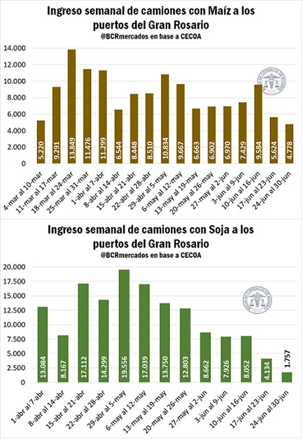 No obstante, a pesar de este buen ritmo en la recolección de los dos principales cultivos del país, debido las complicaciones logísticas que imponen la falta de gasoil y los intermitentes cortes de ruta que llevaron a cabo los transportistas en la última semana como medida de protesta se desplomó el ingreso de camiones a las terminales portuarias de la región. Entre el viernes 24 y el jueves 30 de junio ingresaron a los puertos del Up-River un total de 7.708 camiones entre las 0 a.m. y las 7 a.m. de cada día, cayendo un 33% respecto de los 7 días previos y un 66% respecto de la semana anterior (10 al 16 de junio), que puede ser considerada como la última semana “normal”.