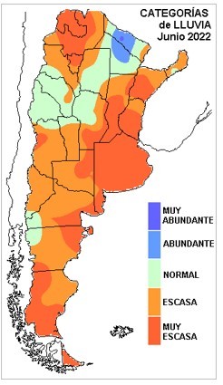 Como podemos observar, las categorías que resumen los desvíos negativos predominan. Las precipitaciones son muy escasas en toda la región pampeana, donde como vimos en el mapa de lluvias registradas, vastas zonas han quedado con registros nulos para junio. En localidades como Pergamino, Junín y en general gran parte de la cuenca del Salado bonaerense, es el primer junio con acumulado pluvial cero en sesenta años.