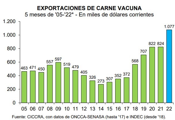 En el acumulado de los primeros cinco meses de 2022 se colocaron en el exterior 241,7 mil tn pp de carne vacuna, es decir 7,8% menos que en enero-mayo de 2021 (20,3 mil tn pp). El volumen fue equivalente a 343,2 mil tn r/c/h (-6,5% anual). Por su parte, la facturación por estos envíos sumó un total de 1.422,8 millones de dólares, valor que se ubicó 30,3% por encima del generado en enero-mayo de 2021 (+330,5 millones de dólares). Fue el aumento del precio promedio declarado el que explicó la diferencia de ritmos, ya que subió 41,2% en términos interanuales y llegó a 5.886 dólares por tn pp.
