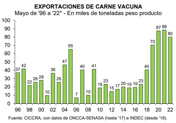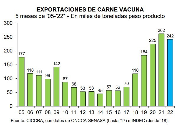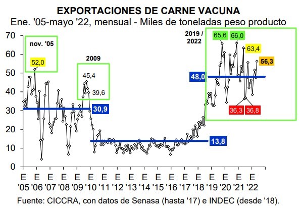 En mayo de 2022 el total exportado de carne vacuna fue de 56,3 mil toneladas peso producto (tn pp). Fue el mayor volumen enviado al exterior de los últimos doce meses, pero resultó 11,2% menor al total certificado en mayo del año pasado. Hay que tener en cuenta que las limitaciones a los embarques de cortes provenientes de vacas que el gobierno nacional impuso en abril de 2021 recién impactaron en los registros de junio. El volumen exportado equivalió a 80,0 mil toneladas res con hueso (tn r/c/h; -5,1% anual).