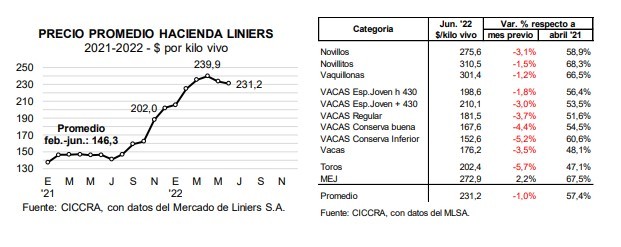 En junio, y por segundo mes consecutivo, el precio promedio de la hacienda en pie comercializada a través del mercado de Cañuelas registró una leve disminución. A la baja de 2,6% de mayo, se sumó otra retracción de 1,0% mensual, ubicándose el precio en $ 231,2 por kilo vivo. En tanto, cuando se contrasta con el arranque de la última primavera, el valor del kilo del animal en pie acumuló un incremento de 57,5% (a un ritmo equivalente de 4,6% mensual).