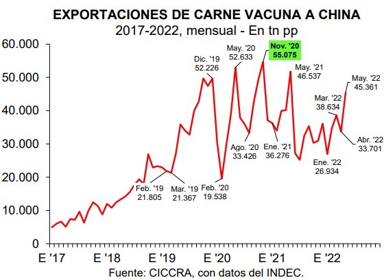 A China se enviaron 45,4 mil tn pp en mayo de 2022 (-12,4% anual), volviendo a representar poco más de 80% del total exportado de carne vacuna desde Argentina, tal como ocurrió hasta mayo de 2021 (es decir, previo a las limitaciones establecidas para exportar cortes provenientes de vacas). En tanto, el precio promedio declarado por estas ventas se ubicó en 5.169 dólares por tn pp en mayo, valor que fue 44,3% superior al registrado en mayo del año pasado.