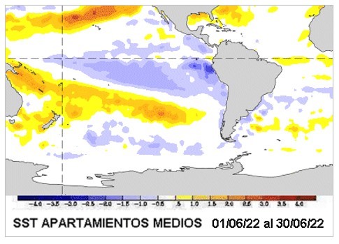 El monitoreo de las temperaturas de las aguas superficiales del Pacífico Ecuatorial central, no arroja una situación diferenciada para el promedio del mes de junio respecto de lo que mostrara el mes de mayo. El fenómeno La Niña, algo más debilitado sigue presente. Los modelos de pronóstico no anticipan cambios en este sentido. El resto del invierno y la transición hacia la primavera, difícilmente presenten novedades en este indicador.