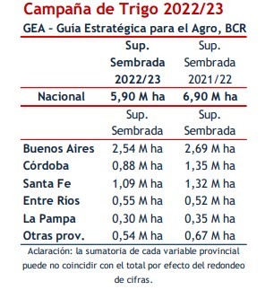 La falta de agua se interpuso en las posibilidades del ciclo 2022/23. Con las labores casi detenidas, la nueva meta triguera es alcanzar a cubrir 5,9 M ha. Y no será fácil. Faltan por sembrar casi 1,2 M ha con trigo, por lo que el área puede seguir cayendo. Hace cuatro años que la siembra triguera no bajaba de 6 M ha: hay que retroceder al ciclo 2017/18 para encontrar un número inferior (5,4 M de ha). Ante la tormenta que pasó casi sin milímetros a principios de esta semana, se realizaron los siguientes ajustes