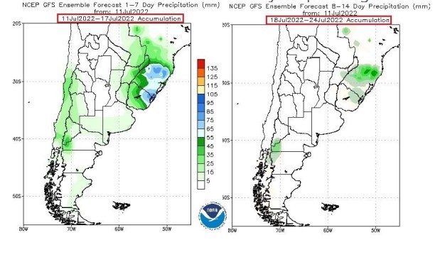 lluvias presentarían valores y distribución geográfica similares a las de los últimos eventos", explica el consultor Elorriaga. Esto es lo que muestra la salida del modelo de la NOAA hasta el 24 de julio para Argentina.