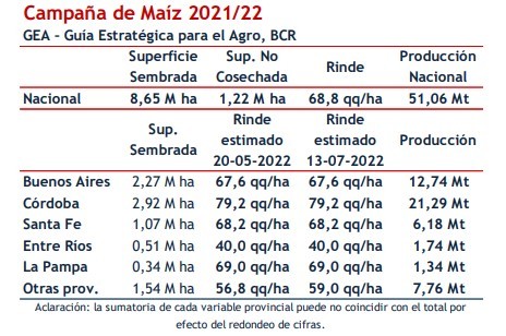 Hay ajustes, en rinde al alza en Chaco (+6qq/ha) y Santiago del Estero (+5qq/ha) y también a la suba en los números de superficie, unas 225.000 ha más, que llevan el total nacional de área cosechada para grano comercial a 7,42 M ha. De esta forma la cosecha maicera Argentina termina alcanzando la barrera de los 51 Mt, algo que parecía imposible en un ciclo muy afectado por la falta de agua. Aunque en gran medida se debe a cambios en el área implantada que marcan un nuevo hito del cereal: 8,65 M ha. Respecto de la estimación de junio de maíz, esto resulta en un ajuste alcista de 1,9 M t para este informe de julio, actualizando la producción argentina a 51,0 Mt. El 85% de avance de cosecha afirma el rinde nacional de 68,3 qq/ha que termina muy muy lejos del promedio de los últimos años, 81,9 qq/ha. De todas maneras, la campaña 2021/22 marca un nuevo récord de área sembrada con un crecimiento interanual del 17%.