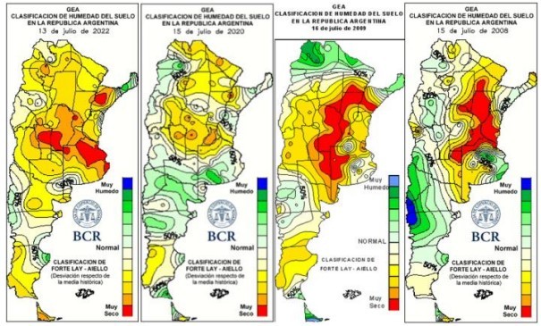 La sequía de julio 2022 ya es más grave que en el 2020, cuando ya había 1M de ha regulares a malas y caía el área sembrada por la falta de agua. No es más grave de lo que pasaba a mediados de julio del 2009, año que arrastraba dos "Niñas"(una fuerte y una moderada). Pero la campaña triguera terminaba bien: un "Niño" recomponía el escenario a partir de la primavera y el rinde país alcanzaba los 25 qq/ha. En cambio, el ciclo 2008/09 empezó mal y terminó mal: el promedio país del trigo terminó en 19 qq/ha. Actualmente, el área extremadamente seca sigue siendo inferior a la de esos dos ciclos. Pero lo que es preocupante de julio del 2022 es la situación de Buenos Aires: la provincia triguera por excelencia está muy afectada por la sequía, sufriendo el peor escenario de siembra de los últimos 15 años.