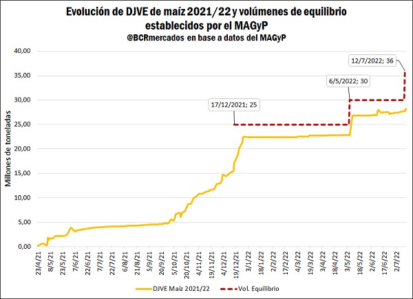 En este contexto de precios bajistas por los granos, esta semana la Subsecretaría de Mercados Agropecuarios del MAGyP aumentó el Volumen de Equilibrio para el maíz 2021/22 en 6Mt. De los 30 Mt que se habían establecido el 6 de mayo último se pasó a 36 Mt. Las DJVE a la fecha, en tanto, suman 28,9 Mt, pero entre el martes (día en que se anunció el aumento del cupo) y el jueves se anotaron 1 Mt.