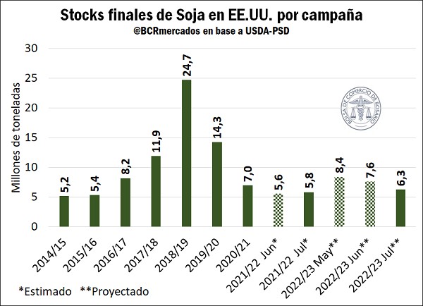 No obstante, en ese informe trimestral el USDA también dio a conocer que el área sembrada con soja para la nueva campaña en EEUU finalmente fue inferior a la que estimaba, por lo que ajustó hacia abajo sus proyecciones de producción para la 2022/23 en EEUU y, consecuentemente, recortó sus proyecciones de stocks finales para el nuevo ciclo.