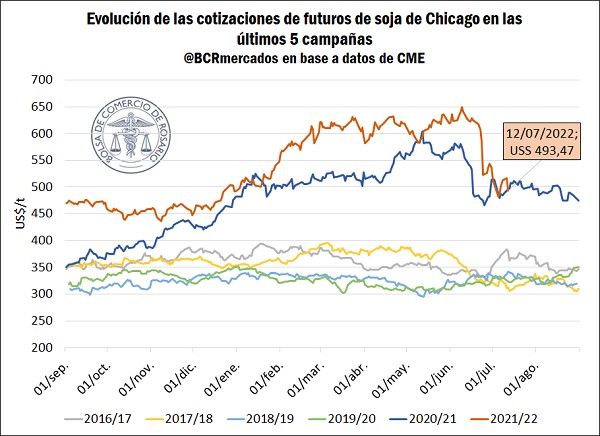 Tomando el caso de la oleaginosa, la evolución de las cotizaciones de soja en Chicago mostró una gran variabilidad desde inicios de 2020, pasando de mínimos a los máximos registros desde agosto de 2012. Respecto de la campaña 2021/2022, luego de haber alcanzado un máximo de U$S 650/t a mediados de junio de 2022, las cotizaciones de futuros comenzaron a retroceder hasta U$S 493/t el 12/07/2022, implicando una caída de U$S 150/t o del 24% en el último mes. Los precios de la campaña 2021/22 del poroto ya se encuentran tocando las cotizaciones de la anterior campaña para el momento del año, después de haberse mostrado muy superiores a los registrados al momento de tomarse la decisión de siembra. El mismo movimiento se replicó en los precios del maíz. Después de llegar a US$ 318/t a fines de mayo, los granos amarillos cedieron casi U$ 90/t y el martes último llegaron a cerrar en US$ 230/t.