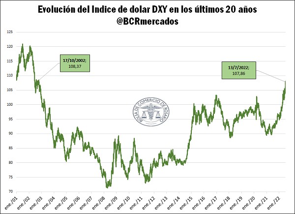 Lo que principalmente está generando la fortaleza del dólar es la expectativa de aumentos más agresivos en la tasa de referencia de la Reserva Federal (Fed), medida para tratar de combatir la inflación. Éstaarribó a 9,1% interanual en junio desde 8,6% de mayo según datos del índice de precios al consumidor (IPC). Dicha fortaleza del dólar afecta las deudas, el crédito, los ingresos corporativos, las exportaciones y las importaciones.