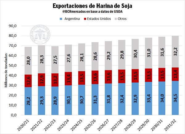 Por otra parte, las exportaciones estadounidenses de harina ascendieron a 12,6 Mt en 2020/21. Según proyecciones para los próximos diez años, Estados Unidos aumentará sus ventas externas en 0,8 Mt, llegando a las 13,4 Mt en la campaña 2031/32 (Ver gráfico adjunto). En el caso de Argentina, se prevé que las ventas externas de harina de soja alcancen 34,5 Mt para el ciclo 2031/32.