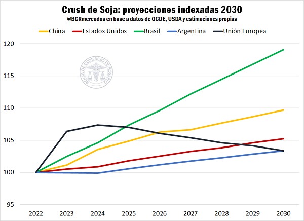 Partiendo del volumen de soja industrializado que se estima para los 5 países líderes en crush durante 2022, es posible aproximar el crecimiento de esta industria en cada uno de ellos durante los próximos años. Según proyecciones de la OCDE (Organización para la Cooperación y el Desarrollo Económico), la molienda de soja en Estados Unidos experimentará un aumento del 5% a 2030. Así, el crecimiento esperado en la industria estadounidense para los próximos 8 años, supera al proyectado para Argentina (3%) y la Unión Europea (3%); pero queda por debajo del crecimiento proyectado para China (10%) y Brasil (19%).