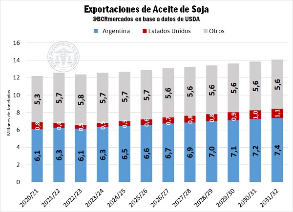 Las ventas de aceite de soja estadounidense 2020/21 totalizaron 781.766 toneladas. El USDA proyecta que Estados Unidos aumente su market share en este segmento en 2 puntos porcentuales, pero estas proyecciones estarán fuertemente condicionadas por la evolución de la demanda interna de aceite para biocombustible.