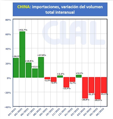 Estas bajas en las compras de China responden en principio a altos stocks generados en las grandes compras de 2021, a las dificultades logísticas que implicaron el cierre de algunas ciudades por rebrotes de Covid, efectos colaterales de la Guerra en Ucrania y el proceso inflacionario que se viene dando en todas las economías mundiales. Por otra parte, en cada oportunidad en que los precios internacionales están muy altos, China no los convalida y espera la retracción para retomar las compras. En función a esto es muy probable que las compras de China se comiencen a normalizar en el segundo semestre de 2022.