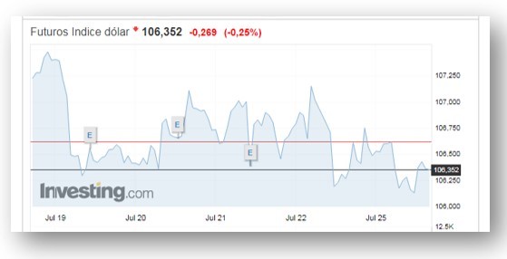 El gráficos nos muestra cómo, desde el 19 de este mes, los futuros índice dólar vienen en baja.