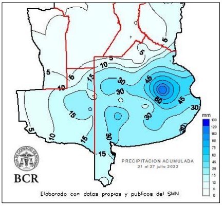 Lamentablemente, esto no se extendió hacia la zona núcleo. Las lluvias continuaron ausentes en las provincias de Córdoba, Santa Fe y en el extremo noreste de Buenos Aires. ¿Qué muestran los pronósticos de corto plazo? No habrá cambios relevantes en la oferta hídrica al inicio de agosto. “Deberemos esperar el avance del nuevo mes para ver si otro ingreso de aire cálido y húmedo se extiende un poco más hacia el centro del país permitiendo alguna recuperación del nivel de lluvias sobre el centro de la región núcleo equivalente al que tuvo Buenos Aires”, explica el consultor Elorriaga.
