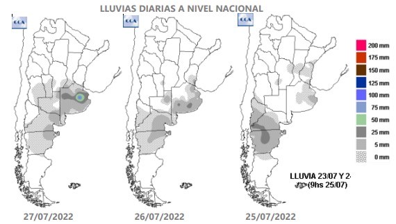 de sistemas precipitantes generalizados sobre el territorio bonaerense”, explica el Dr. Aiello. Los acumulados oscilaron entre los 15 a 40 milímetros con algunos valores que estuvieron por encima de las medias mensuales como fue el caso de Saladillo con 60 mm y Las Flores con más de 100 milímetros. Las lluvias continuaron ausentes en las provincias de Córdoba y Santa Fe.