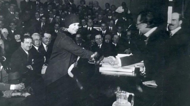 La foto que abrió la nota es del Archivo Gráfico de la Universidad de Buenos Aires. En esta toma, puede verse a Ricardo Rojas, entonces Rector de la UBA, entregándole su diploma al año siguiente.