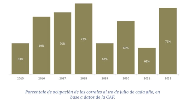 Hoy los feedlots muestran un nivel de ocupación muy elevado, más del 70% de ocupación según datos de la Cámara de Feedlots (CAF) con casi 2 millones de animales encerrados, según los datos informados por el SENASA a inicios de julio.
