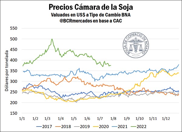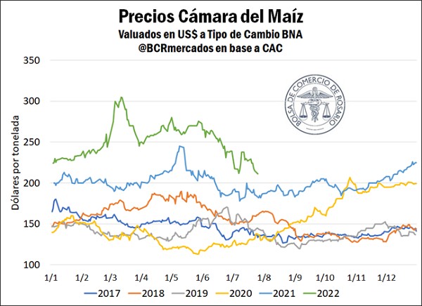 En este marco bajistas, los precios locales medidos en dólares se encuentran un 14% y 13% por encima de los valores del año pasado para los respectivos casos del maíz y la soja. Considerando una inflación estadounidense del 9% interanual en junio del 2022, es evidente que en términos reales los precios no están lejos de los valores que se observaban el año pasado.