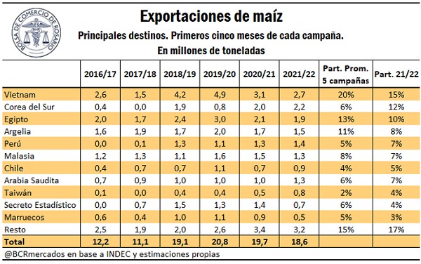 En los primeros cinco meses de la campaña de maíz, dos países a más de 17.000 kilómetros de Argentina se llevaron más de un cuarto del comercio exterior del grano amarillo. En este sentido, Vietnam se muestra como socio estratégico, manteniendo su lugar como primer comprador maicero en las últimas cuatro campañas, aunque con mermas en sus compras en esta última campaña.