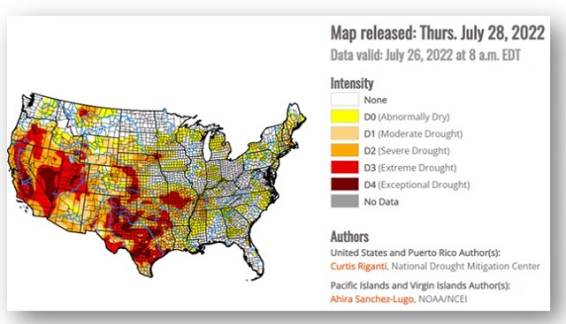 El mapa publicado el 28 de julio pasado es claro. El preocupante color amarillo -y más todavía el naranja y rojo- está esparcido por buena parte de la zona agrícola.