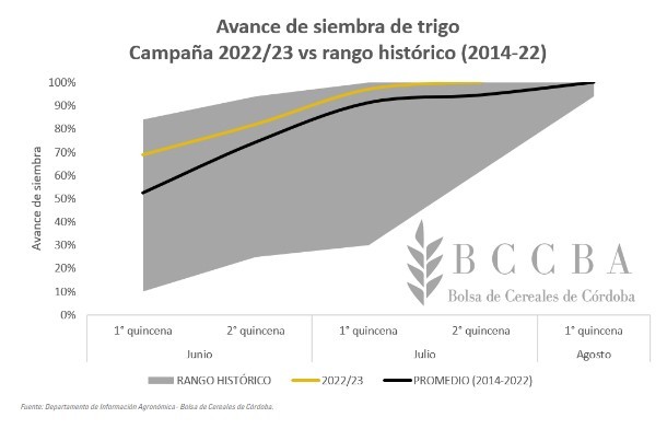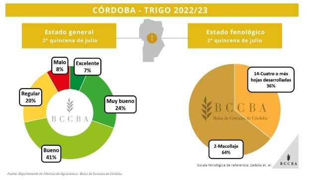La última estimación de siembra de trigo realizada por el Departamento de Información Agronómica de la BCCBA, arroja para la presente campaña una caída del 28 % interanual en la superficie, la cual sería la más baja de los últimos 8 años. La región este y sur sería la de mayor área implantada, principalmente en los departamentos San Justo, Marcos Juárez y Unión. Hacia fines de julio, la totalidad del área ya se encontraba sembrada. A la fecha de relevamiento, el 64 % del cultivo en pie se encontraba en etapa de macollaje, momento en que el cultivo genera el área foliar necesaria para capturar radiación solar y a partir del cual comienzan a diferenciarse las espiguillas, sobre las que luego se desarrollarán los granos. El restante 36 % estaba desarrollando hojas. Más del 70 % de los lotes presentaba un estado general entre excelente y bueno, correspondiendo en su mayoría a lotes cultivados bajo riego, al tiempo que el 28 % se encontraba en regulares y malas condiciones debido al estrés hídrico y a las bajas temperaturas y heladas.