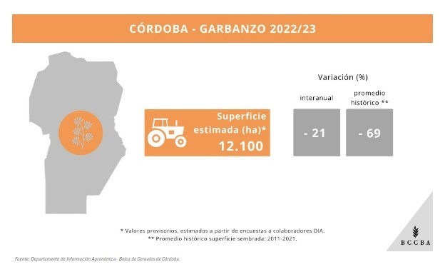 Para la campaña 2022/23 se espera la menor superficie sembrada con garbanzo de los últimos 11 años, llegando casi a las 12 mil hectáreas, lo que implicaría una caída del 21 % interanual y del 69 % con respecto al promedio histórico (2011-2021). La mayor parte del área se sembró hacia el norte de la provincia, concentrándose en los departamentos Colón, Totoral y Río Primero.