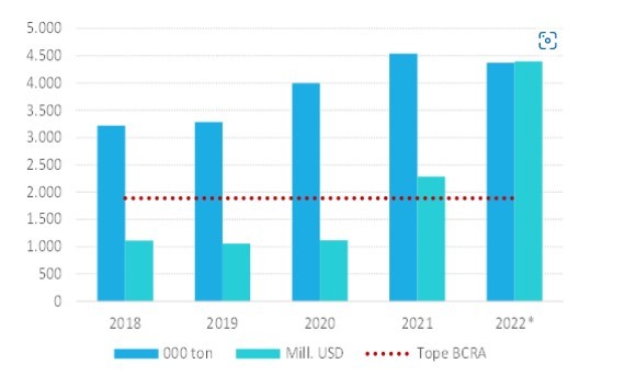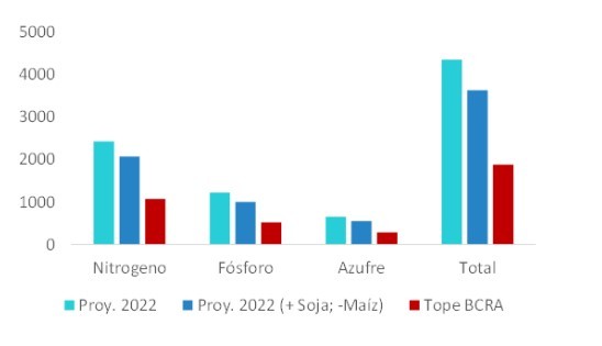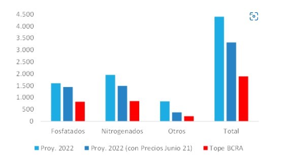 Dada la importancia de los fertilizantes importados en el consumo total de Argentina, las necesidades de importación crecieron significativamente. En este contexto, se suman preocupaciones por medidas impuestas por el Banco Central para la adquisición de divisas para importación, estableciéndose un tope equivalente al menor del valor de las importaciones FOB de 2021 más un 5%, o de las importaciones del año 2020 más un 70%, que se estima en USD 1.889 millones.