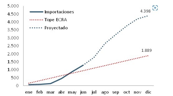 También se muestra el cupo impuesto por el BCRA que, anualizado, se estima en 1.889 millones de dólares, cifra que no sólo es significativamente más baja que el valor de las importaciones proyectada para 2022 (4.398 mill. USD) sino que, incluso, significaría la necesidad de reducir las importaciones a niveles aún más bajos que los observados en 2021 (2.285 mill. USD).[4]
