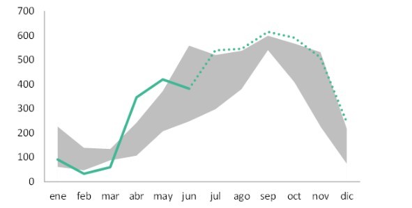 Fuente: Bolsa de Cereales a partir de datos de Indec. El área sombreada represnta los máx. y mín. entre 2018 a 2021.