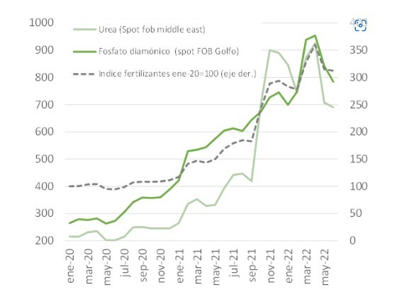 Ya en 2022 la situación continuó con un alto grado de volatilidad. La invasión rusa de Ucrania en febrero condujo a una dramática alza en los precios, reflejando las preocupaciones sobre el efecto que la guerra tendría sobre las exportaciones rusas de fertilizantes y, por extensión, en el suministro mundial de estos insumos, dado que las exportaciones rusas son las más grandes, en valor, del mundo (Fernández, 2022)