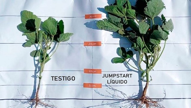 JumpStart líquido se trata de una nueva tecnología de inoculación para soja, que permite solubilizar nutrientes, especialmente fósforo a través de esporas de Penicillium bilaiae. Este hongo excreta ácidos orgánicos al medio rizosférico y de esta forma, facilita la movilización de los nutrientes, dejándolos más disponibles para el aprovechamiento de las plantas. Esto genera un mayor crecimiento de las raíces, aumentando la captación de nutrientes y el rendimiento.