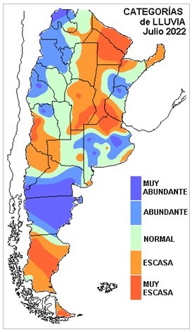 De acuerdo a lo que venimos describiendo a lo largo del invierno, no sorprende la fuerte anomalía negativa que domina la zona núcleo central. La mejora de las lluvias en el centro del litoral y el sur de la región pampeana fue significativa y si bien hay matices entre la categoría normal y abundante, la recuperación que se percibe a campo es significativa y de gran escala.