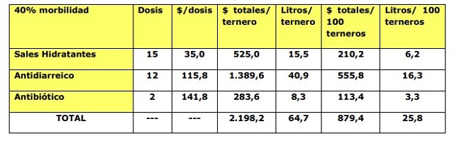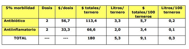 Como lo hicimos en las diarreas, el costo de 1 tratamiento será de $180 y en litros de leche será de 5,3 litros de leche, pero al poner este costo sobre los 100 terneros que pasaron por la crianza, el costo será con el 5% de morbilidad de $9,1 o su equivalente en litros de leche 0,3.