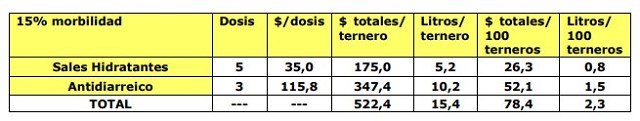 Aclaración: ¿como se explica este cálculo?: Hay que tener en cuenta que, de cada 100 terneros, se tratan solo 15 (15% de morbilidad), por lo que el costo del tratamiento de esos 15 terneros se distribuye por 100 terneros.