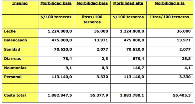 Suponiendo que la mortalidad de una crianza con morbilidad baja (15%), tenga un 5% de mortalidad, de cada 100 terneros se deslecharán 95 terneros, es decir el costo del ternero criado será de (1.882.847/95): $ 19.819 por ternero que largamos de la crianza. Mientras que, si tenemos si consideramos el sistema con alta morbilidad (40%), su mortalidad estará en alrededor del 20% y solamente largaremos 80 terneros del total de 100, por lo que el costo por ternero será de (1.883.780/80): $23.547. Es decir, de hacer las cosas bien a hacerlas mal, la diferencia económica será de $3.728 por ternero o $372.800 por cada 100 terneros salidos de guachera o, expresado en litros de leche 109,6 litros por ternero o 10.960 litros por cada 100 terneros logrados.