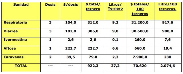Pasando al tercer costo es la sanidad que debemos proporcionar a nuestros terneros. Para ello consideraremos las dos vacunas contra diarrea y neumonía que colocaremos a sus madres con el fin de proporcionar anticuerpos calostrales a sus hijos y una tercera dosis durante el periodo de crianza. También una dosis de fiebre aftosa (vacunación obligatoria por ley), una dosis de ivermectina al nacimiento y dos caravanas de identificación, por lo que dicho costo quedará de la siguiente manera: