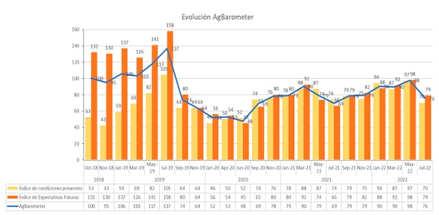 Si bien desde mediados de 2021 había comenzado a observarse un incremento lento, pero sostenido, en los indicadores de confianza del productor medidos por el Ag Barometer Austral; la edición de Julio 2022 marca una fuerte caída del 22% con respecto a los datos de mayo pasado. Adicionalmente, se produjo una marcada preocupación de los actores por la situación financiera en los próximos 12 meses: el 86% de productores que vislumbra principalmente malos tiempos para el sector de aquí a 1 año, mientras que en el índice anterior había sido del 59%. Además, se trata de la caída más baja desde que comenzó la encuesta en octubre de 2018.