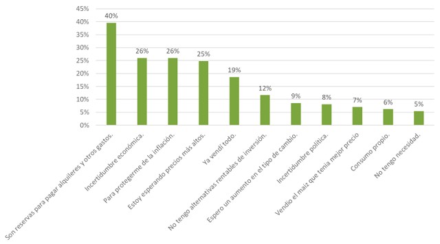 En cambio, remarcan la existencia de otros factores que sí determinan la espera para vender remanentes de soja de parte de los productores: el 40% menciona la necesidad de pagar gastos (tanto en alquileres como insumos), 26% la incertidumbre económica, 26% la protección contra la inflación y 25% la expectativa de precios más altos. También, un 12% de los productores menciona como factor relevante la falta de alternativas de inversión.
