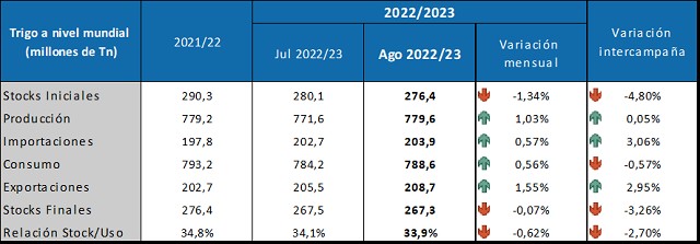 A nivel mundial, se proyecta una producción de 1.179,6 millones de toneladas, 6,3 millones de toneladas por debajo de la estimación de julio. Las existencias finales alcanzarían los 306,7 millones de toneladas. Este último dato es 3,1 millones de toneladas más bajo que lo esperado por el mercado.