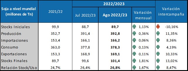 Para el nuevo ciclo, la producción sudamericana se mantiene sin cambios y sería de 149 millones de toneladas para Brasil y de 51 millones de toneladas para Argentina. Para la nueva campaña, se estima una producción mundial récord de 392,8 millones de toneladas, superior a lo estimado en julio. En cuanto a las existencias finales, se proyectan en 101,4 millones de toneladas, cuando el mercado esperaba 99,5 millones de toneladas. Las importaciones por parte de China se mantienen estables en 98 millones de toneladas.