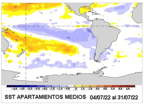 Como vemos en la figura, el enfriamiento se viene dispersando, su mueve hacia el sur y sobre la línea ecuatorial alternan con aguas que promedian valores de temperaturas superficial normal. Son modestos indicios que pueden devenir en una primavera con una Niña en retirada, pero que sin embargo puede tener influencia negativa sobre la circulación atmosférica.